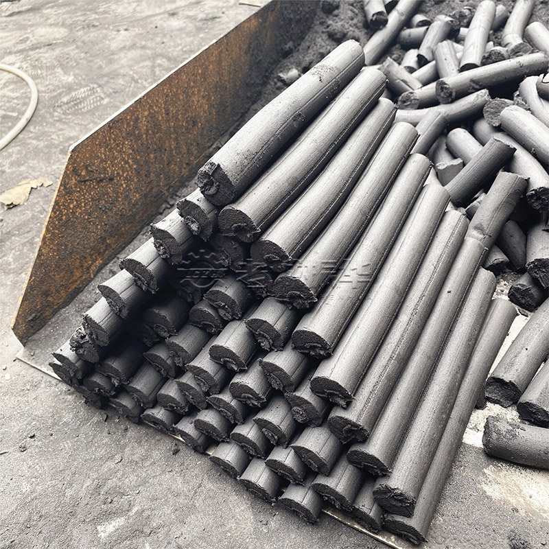圖中成品形狀:實心多孔圓棒,原料蘭炭粉;